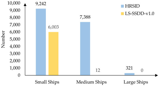 Figure 6 shows the comparison of the number of ships of three sizes in the two datasets. When the datasets processed the ship targets, they were divided into three types according to the area size: small ships (area less than 48