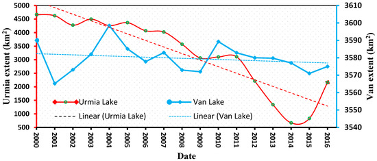 We analyzed LU and LV aerial changes from 2000 to 2016. Enhanced Thematic Mapper Plus (ETM+) was used from 2000 to 2012, and Operational Land Imager (OLI) sensor was used from 2013 to 2016. A series of 85 Landsat images acquired from 2000 to 2016 were used to investigate changes in the surface area of the lakes. The lake extents for each year, together with the 17-year trends for each lake, are shown in Figure 4. Generally, the surface area of LU showed a decreasing trend from 2000 to 2016. In contrast, the surface area of LV remained relatively constant during the same period. As seen in Figure 4, LU’s largest decrease in surface area occurred from 2011 to 2014.