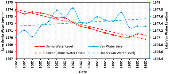 From 2000 to 2016, the maximum water level of LU (1273.8 m) was in 2000, while the highest in LV (1647.8 m) was in 2007 (Figure 5). The lowest water levels in 2014 were 1270.1 m in LU (a loss of roughly 3.75 m) and 1647.0 m in LV (a loss of approximately 0.8 m) in 2002. In general, a decreasing tendency in water level (average of around 0.21 m/year) was recorded for LU. On the other hand, from 2000 to 2016, the overall change in water level for LV was close to zero or slightly positive (10 cm/year) (Figure 5).