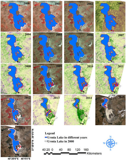 The general decrease in the surface area of LU by the annual maps of the surface area from 2000 to 2016 is shown in Figure 6, and the rather constant surface area of LV during the same period is illustrated in Figure 7. As shown in Figure 6, the surface area at the southern shore of LU was the first to recede, followed by the surface area at the eastern and then the northern shores. The surface area along the western shore was the least sensitive to recession. The average surface area of LU from 2000 to 2016 was approximately 3138 km2, with maximum surface areas of 4666, 4624, and 4496 km2 recorded in 2000 (Figure 6), 2001, and 2003, respectively. The corresponding average surface area of LV was approximately 3579 km2, with maximum surface areas of 3598, 3590, and 3589 km2 recorded in 2004, 2000, and 2010, respectively (Figure 7). Minimum water surface areas for LU were approximately 700 and 800 km2 and were recorded in September 2014 (Figure 6) and 2015, respectively.