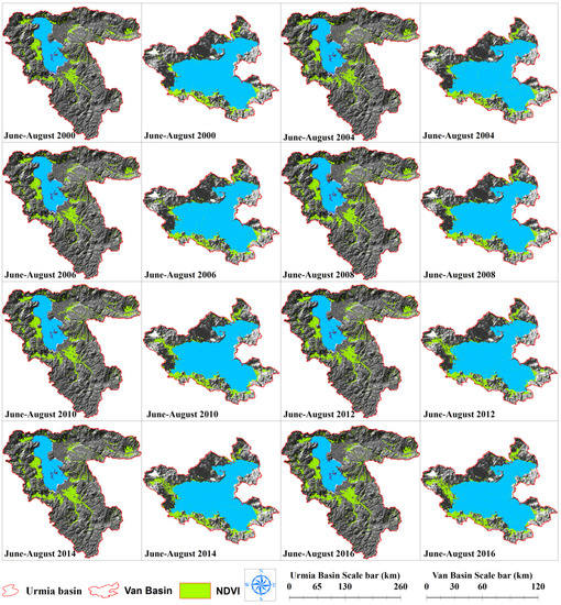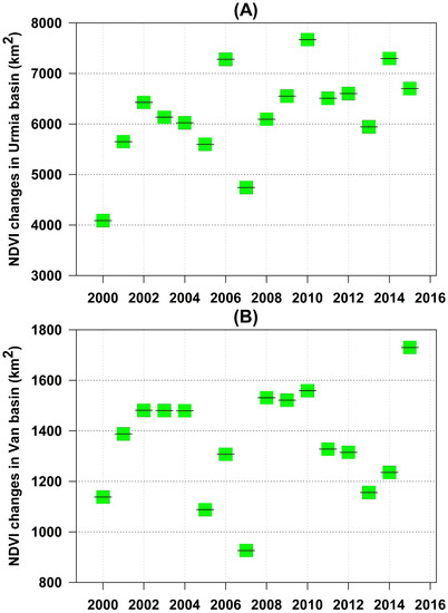 NDVI data were utilized to investigate long-term changes in the area of irrigated lands in both LU and LV basins. The July to August period from 2000 to 2016 was selected to represent maximum irrigation on farms and minimum vegetation in the remainder of the basins. Because of the limited timespan of MODIS imagery, the NDVI in 2000 was selected as a baseline for change detection. Based on our analysis, an increase in NDVI values from 2000 to 2016 was observed in most years in both lake basins (Figure 8). The greatest annual increase for the LU basin occurred in 2007, with other maxima occurring in 2003, 2004, and 2005. Generally, the satellite images showed an increasing trend in NDVI values from 2000 to 2016 for both basins. However, the increase in NDVI values was greater in the LU basin, as evidenced by the steeper slope of its linear trend plot relative to that of the LV basin.