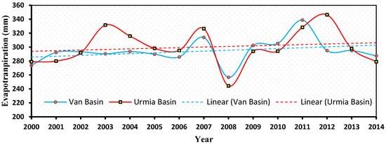 According to MODIS ET, the average ET in the LU and LV basins from 2000 to 2014 was roughly 300 and 294 mm/year, respectively (Figure 10). Maximum annual ET was calculated to be 346 (2012) and 338 (2011) mm/year, respectively. ET was higher in the eastern and western areas of the LU basin than in the center, northern, and southern regions, according to a spatial analysis of ET maps in the LU basin (Figure 11). Lower ET was recorded exclusively in the southern part of the LV basin. When comparing Figure 10 and Figure 11, it is clear that the difference in average annual precipitation between the two basins was greater than the difference in annual evapotranspiration. Accordingly, it can be concluded that evapotranspiration is not the main factor in shrinking the LU.