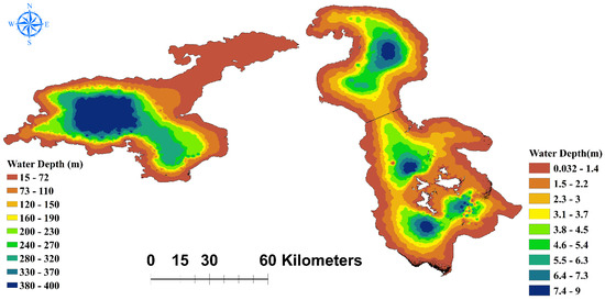 Figure 12 shows the water depth for both lakes. LV is significantly deeper than LU. The maximum water depth in a considerable portion of LV is roughly 400 m, but the maximum water depth for LU only for restricted areas is approximately 9 m. In contrast, the mean depth of LU in 2000 was approximately 2.2 m, and approximately 172 m for LV. LU’s deepest and shallowest portions are located in the upper, inner islands, and peripheral areas. These sections of LV are located on the lake’s western and central sides, as well as its northern and peripheral zones. Notably, a large part of LU is shallow, while LV shows the opposite. Hence, the evaporation will be significantly different due to the difference in thermal classification in the lakes.
