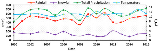 The results for precipitation (rain and snow) and temperature in the LU and LV basins are shown in Figure 13. From 2000 to 2016, the amount of snow in both basins showed a slightly negative trend, whereas rainfall showed a slightly positive trend. The temperature in the basins was shown to be associated with these developments. Furthermore, the LV basin receives more snowfall, rainfall, and total precipitation than the LU basin. Temperatures were higher in the LU basin (Figure 13), and both basins showed a somewhat positive trend.