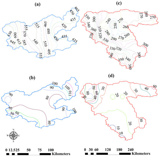Spatial distribution of rainfall and snowfall (mm) in the LV (a,b) and LU basin (c,d) respectively, based on [20].