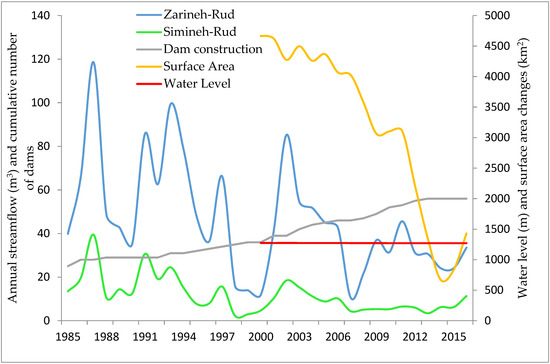 According to the Iranian Ministry of Energy, about twenty dams were built on major rivers in the LU basin between 2000 and 2013 (Figure 16). However, as seen in the graph, the number of dams built and the annual streamflow for the two main rivers fell from 2000 to 2015 (analogous dam data were not available for the LV basin; however, the water level in LV remained relatively stable from 2000 to 2016).