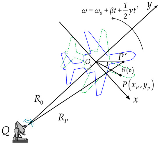 Assuming that the translational compensation [34] has been finished, a two-dimensional ISAR imaging geometric model for a maneuvering target is presented in Figure 1.