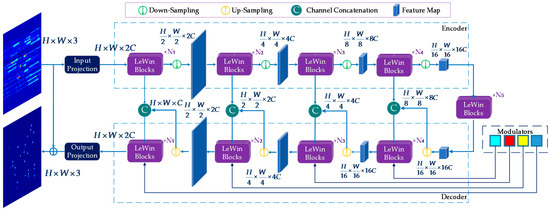 The overall architecture of the proposed generator is a symmetric hierarchical structure following the spirits of U-Net, as shown in Figure 3. The generator consists of an encoder, a bottleneck, a decoder, and several multi-scale restoration modulators. The input is the blurred ISAR image represented by , with the image size of and the channels of 3. Firstly, a 3 × 3 convolution with LeakyReLU is adopted to extract the shallow features represented by . Then is fed into four consecutive encoder levels. Each level includes several LeWin Transformer blocks connected in series and a down-sampling operation of a 4 × 4 convolution with stride two. After each level, the height and width of the feature maps are halved while the feature channels are doubled. Next, LeWin Transformer blocks connected in series as the bottleneck layer are used to capture longer dependencies.