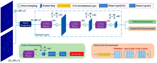 In the design of our proposed discriminator, as shown in Figure 4, global GAN and PatchGAN are fused. Firstly, a shared layer consisting of LeWin Transform blocks and down-sampling layers is presented to extract shallow features, which have a similar structure to the encoder in the generator. After three levels, the network is divided into two paths. In one path, two dense layers are used, with channels 512 and 1 following an encoding layer to extract the global features. The other path employs a 3 × 3 convolutional layer to output a feature matrix containing all patch-level features for evaluating the local texture details.