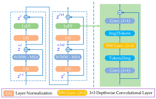 Unlike the standard Transformer, the LeWin Transformer block performs a multi-head self-attention (W-MSA) for the non-overlapping local windows to reduce the computational cost, as shown in Figure 5. Moreover, the traditional Feed-Forward network is improved by adding a deep convolutional layer to enhance its local expression ability as the Locally-enhanced Feed-Forward Network (LeFF).