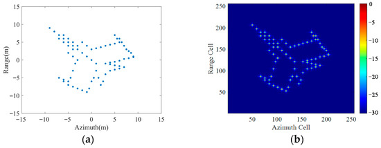 A block target sample from test set: (a) The coordinate distribution of the scattering points; (b) The ideal ISAR image.