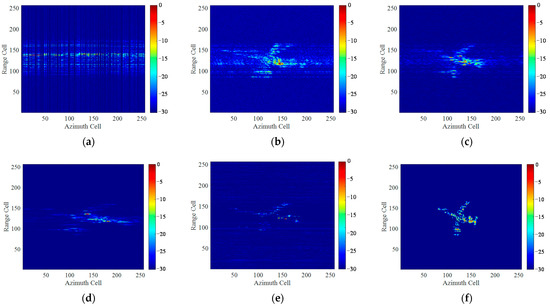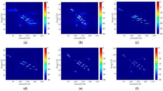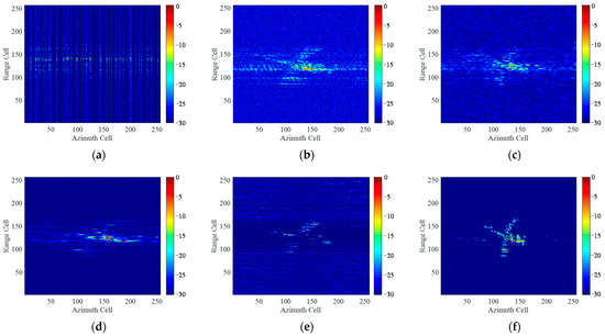 Figure 19 shows the imaging results without adding extra noise under full aperture. Figure 19a presents the “dechirped” echo after motion compensation. Figure 19b–f presents the imaging results by several traditional algorithms. It can be seen that the spectrum is heavily expanded along azimuth direction by RD algorithm. STFT algorithm alleviates the blurring issue of the image but has a low time-frequency resolution. The SPWVD method suppresses the cross-terms at the expense of stretching the spectrum in the azimuth direction, and the image contrast is severely decreased. RWT method improves the time-frequency resolution but has a weak ability to distinguish weak scattering areas from background noise, leading to a structural loss of the target scatterers. By contrast, the proposed method achieves superior performance, reconstructing a high-resolution ISAR image with rich details and fine textures.