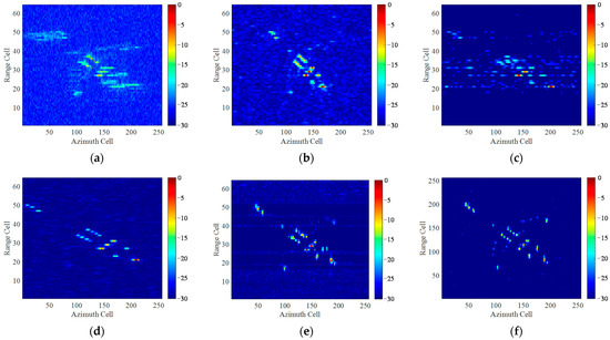 In this section, we use the pseudo-measured dataset presented in Section 4 to carry out imaging experiments for maneuvering block targets. The radar parameters are set as the same as measured Yak-42 data, where the size of the echo matrix is 256 × 256, the carrier frequency is 5.52 GHz, the bandwidth is 400 MHz, the pulse width is 25.6 µs, and the PRF is 400 Hz.