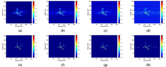 Figure 17 shows the imaging results of the four experiments. It can be seen that under the condition of acceptable noise level and sampling ratio, the blurred ISAR images of the maneuvering block targets can be effectively restored by the network to high-quality images without phase error. Even under more extreme imaging conditions, as shown in Figure 17d,h, the target subject region of the image can still be deblurred though there appear some hot pixels.