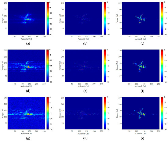 Imaging results of Yak-42 by different methods: (a,d,g) RD algorithm; (b,e,h) The method in [22]; (c,f,i) The proposed method.