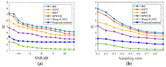 Performance curves of IE versus SNR and sampling ratio of six different methods: (a) Performance curves of IE versus SNR; (b) Performance curves of IE versus sampling ratio.