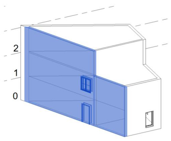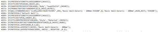 Similarly, the as-planned model is assumed to be a BIM model of the building. Usually, the BIM model is converted into a point cloud before use for a compatible comparison with the as-built point cloud model. However, the conversion may limit the details in the model and causes the loss of quality in its extracted geometrical parameters. Therefore, the current study directly extracts the geometrical details from an IFC-based BIM. The Industry Foundation Classes (IFC) data model is a neutral and open file format, registered as an official international standard ISO 16739:2013. The file format is object-oriented and commonly used for Building information modelling. Objects have a precise position in space and are distinguished by categories, characteristics, and function. IFC models include geometric and non-geometric entities: the building geometry and data associated with its elements. The IFC data schema assigns a name to, and relationships between, objects. It describes identity and semantics (ID, object, name, function), characteristics (material, color, properties), relationship between objects (e.g., walls, slabs, windows), abstract concepts (e.g., performance, costing), processes (e.g., installation, assembly), and people (e.g., owners, designers, contractors, managers). Figure 1 shows an example of the IFC data format in plain text form that contains different entities exchanging various types of information related to building components. To obtain the plane segments from the as-planned model, the mesh model is constructed according to the geometrical details of structural elements from the IFC-based BIM in an automated way, as shown in Figure 2. The required geometrical shape information, including the vertices and faces from the planar structural elements, like walls and roofs, are taken out from each element by processing their geometric information. The elements are stored in IFC schema under the entity ‘IfcProduct’ with the inheritance (IfcRoot → IfcObjectDefinition → IfcObject → IfcProduct). The geometric information (such as shape, position, direction etc.) of the elements is obtained by traversing the representation attributes. The processed information of these elements in the form of vertices and faces is then used to create their mesh for further processing. Later, the required plane parameters can be directly acquired from the mesh in an accurate and efficient way, without any need of point cloud conversion.
