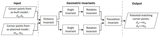 The combinations of invariants that sequentially process the pairs of candidate corner points for matching are arranged to identify the potential matching corner points with less possible computation. The first step rejects the non-matching pairs without the need to calculate other parameters, thus reducing the processing time of the succeeding steps. The non-rejected pairs are further probed in a step-wise arrangement using the required parameters that were computed in the preceding step. Furthermore, the identification of potential corner points can be performed using all the extracted corner points from both models. However, the processing time can be increased exponentially in the case of a high number of corner points and can affect the time efficiency. Therefore, the two corner points from both models are randomly picked in each cycle using RANSAC with a defined number of cycles to ensure robustness during the current stage of identifying the potential matching points using geometric invariants.
