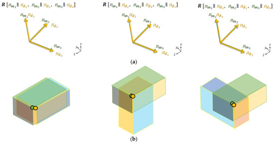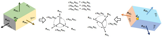 After acquiring the plane segments from both models, all the possible corner points are extracted. The corner point is the unique intersection point between three non-parallel plane segments. For the given plane segments , and , with their respective normal vectors , , and , the coordinates of their intersection point (Figure 3a) can be computed using the given formula: