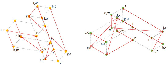 The identification of potential matching corner points from the as-built (left) and the as-planned model (right). The edges of the arrow with the same labels [a, b, c, …, y, z] in both models represent the potential matching points.
