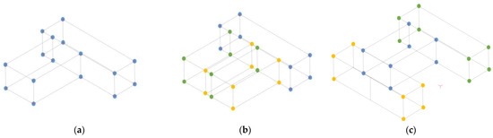 Visualization of the corner points from the as-built (yellow) and transformed as-planned model (green) resulting in aligned corner points (blue) according to each cluster transformation (a–c).