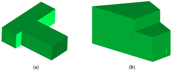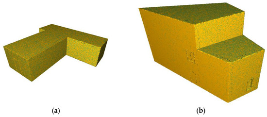 The simulated datasets were artificially designed to represent the building models with different structural compositions for testing, as shown in Figure 13. Using such datasets allowed for the assessment of the theoretical foundation of the proposed method, without effect of errors typical for real life situations. The BIM models in IFC format were used as as-planned models, whereas randomly transformed models in point cloud format was used as as-built models. Both simulated models have nine plane segments; however, the first model represents a single-floor building while the second one represents a triple-floor building.