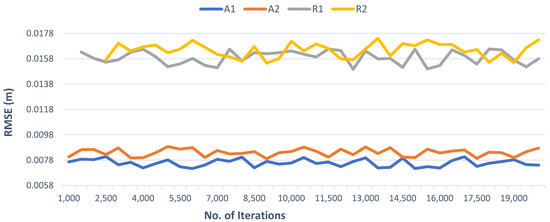 The proposed method is RANSAC-dependent to ensure robustness, so the number of iterations could have an influence on the success. Although increasing the number of iterations results in more potential matching points with a cost of higher processing, this does not improve the registration accuracy (as shown in Figure 16) as the method already ensures the highest accuracy by detecting the remaining matching points after selecting the most optimal cluster in the third step. Generally, the method can only fail if the potential matching corner points obtained in stage 2 do not include any actual matching point, which can happen if the number of RANSAC iterations is too low. During testing, the method failed for dataset R1 and R2 prior to a number of iterations of 1500 and 2500, respectively. By increasing the number of iterations, this problem was resolved. In our results, 5000 iterations were found to be sufficient for both robustness and successful execution of the proposed method for all tested datasets.