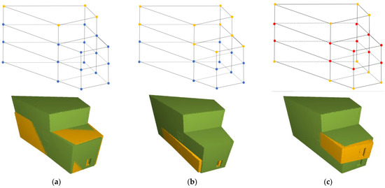 The potential matching points are identified using a series of geometric invariants to try to ensure that only the actual matching corner points are detected; however, geometrical symmetry in the building can still lead to the selection of non-matching points. To further explore this problem concerning construction progress monitoring, the proposed method was also tested for partially built buildings to analyze its success. For this purpose, two additional as-built models derived from dataset A2 (Figure 17), representing the completion of the first and second floor, were created.
