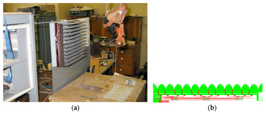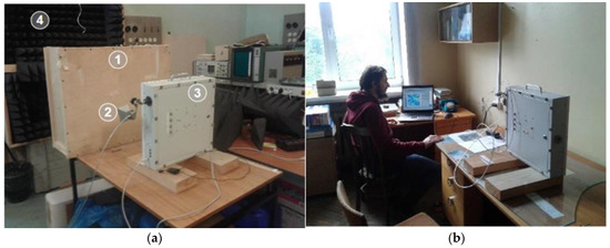 The experimental stand was mounted in the laboratory building of IZMIRAN—see Figure 4a. The setup included a wall simulator, an 80 × 60 × 30 cm box filled with dry sand, and a container of test objects (1). The radiator horn antenna (2), the receiver antenna array (3), and the test object container were placed on a work table surrounded by radio-absorbing material (4). In order to reconstruct the image of the subsurface object by Kirchhoff approximation [1,21] and visualize the results, the internal device software was used, as well as special computer codes developed in Matlab environment—see Figure 4b.