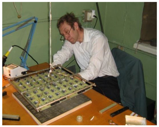 Experimental tests of this device were carried out at the EPOS department of IZMIRAN (A.E. Reznikov, V.V. Kopeikin, S.A. Annakuliev) and later in St. Petersburg at JSC Jupiter-Z (N.A. Fedorov, N.E. Podozerov), together with A.V. Popov and graduate students V.A. Vinogradov and S.A. Zapunidi [17]. The development of a planar antenna array for subsurface radar (V.V. Kopeikin, N.A. Fedorov) also was started there—see Figure 3.