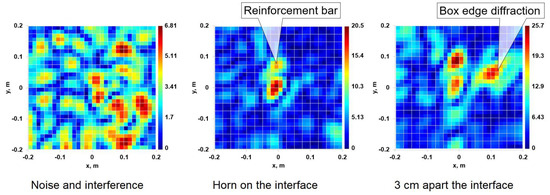 Experiments with side-wall illumination were carried out both with the transmitter antenna located on the media interface and in the case of remote illumination—see Figure 6. The level of the registered signal from the reinforcement bar in sand, judging by the holograms, was more than by 10 dB higher than the noise level. Tests with the illumination at an angle to the medium surface plane and evaluation of the registered signal level were carried out as well. In order to reduce the influence of the illumination of the receiver antenna array with the reflected wave, in some experiments it was placed on the back side of the box—see Figure 5b.