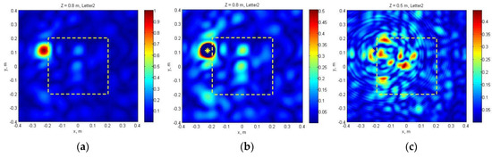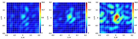 Finally, at m (effective distance to the object), the brightness of the radiator image is reduced to the noise level and, unlike the frontal imaging scheme, no “biting out” of the reflected wave is required. Each of the images in Figure 19 already gives a good idea of the scattering object, although the synthetic aperture method can still improve the image quality.