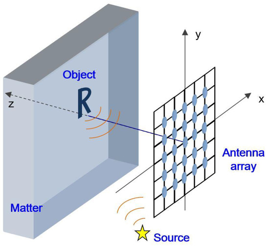 In the literature on georadar (ground penetrating radar, GPR), the idea of using the holography principle [1] to obtain in real time a volumetric picture of subsurface scatterers or electrically contrasting media boundaries has long been discussed (see, e.g., [2,3,4]). Attempts of subsurface object visualization by means of microwave holography started in the 1960s [5]. During those times, the possibilities of measurement and computation were not adequate to perform this task. Recently, substantial progress was made in the radio-frequency wave monitoring of closed rooms and identification of moving objects (“through-wall vision” [6]), as well as in the problems of defectoscopy, medicine, hidden weapons detection, and humanitarian demining [7,8,9,10,11,12]. Here, basic difficulties are encountered: the unfavorable relationship between the wavelength, object dimensions, probing range, and antenna array aperture; the EM wave attenuation in subsurface matter; and strongly interfering interface reflection. These problems are partially mitigated by scanning the material surface with a combined microwave transceiver. Considerable progress in instrumental and methodical development has been described in a number of monographs and journal publications (see, e.g., [13,14]). However, the scanning method essentially hinders and complicates the process of subsurface vision and limits the range of practical applications.