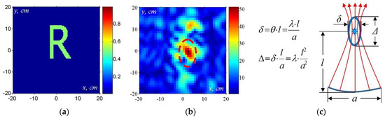 Test object (a) and its diffraction-limited image (b)—experiment; estimates (c) of longitudinal and transversal resolution for a finite antenna aperture . Red arrows symbolize complex rays of backward wave migration, blue ellips marks the focal spot size.