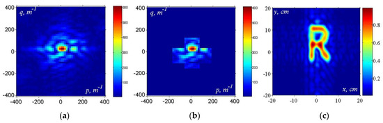 A better result can be achieved by a smooth approximation of the source image by a Gaussian wave beam (see Figure 15a) diffracted by the rectangular contour of the receiver antenna and subtracted from the experimental hologram in the imaginary source plane (see Figure 15b). In this case, spurious effects do not mask the image of the object in the middle of the frame—Figure 15c.