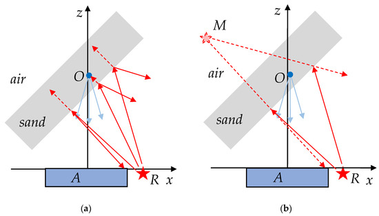 As experience shows, the main problem in the detection and imaging of subsurface objects is the interference of the weak scattered signal with a powerful wave reflected from the boundary of the material medium—see Figure 13a. Fortunately, in most applications this boundary is a rather flat surface forming a regular reflected signal. In this case, we can assume that the wavefront conversion procedure should give a compact specular image of the radiation source in the plane of the imaginary source —see Figure 13b. The experiment confirms this hypothesis.