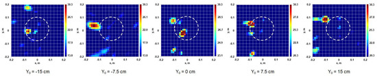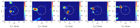 The results of measurements with multi-position illumination of a metal disk of 18 cm in diameter are shown in Figure 21. The horn radiator scanned an interval Y0 = −15 to +15 cm. We can see that in the oblique illumination scheme, if the specular reflected wave does not fall into the receiver antenna aperture, the main contribution in the received signal gives the “edge wave” well known in the theory of diffraction by planar objects [1,21]. Each of these individual images has practically no resemblance with the original—just a small bright spot at the edge of the planar object.