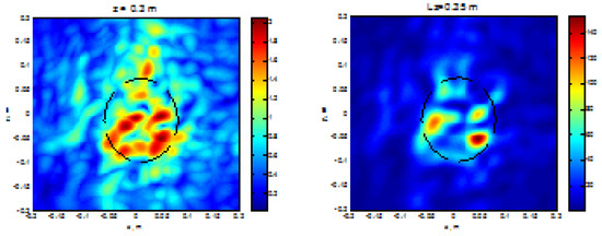 On the other hand, using the developed measurement technique with coherent multipoint illumination, a recognizable image of the object hidden in the subsurface medium at a depth of 10–12 cm could be obtained from a height of about 0.3 m—see Figure 22.