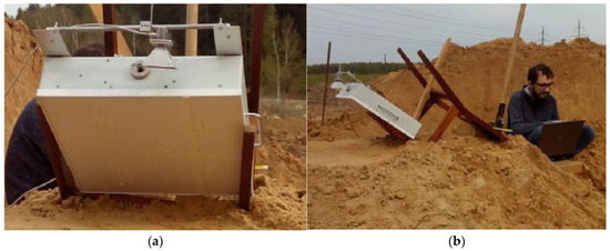 After the studies on the experimental stand, with the purpose of refining the experiment methodology, field tests were carried out on the localization of foreign objects in the ground. The experiments were performed in the area of Kaluga highway, at one of its reconstruction sites. As the underlying ground, the road bed (sand-gravel mixture with an admixture of clay) was chosen. Rather high humidity of the underlying medium was caused by prolonged rainfall on the eve of the experiments. The device was installed at an angle of 35–40 degrees to the ground surface. Photographs of the improvised experimental setup are shown in Figure 23.
