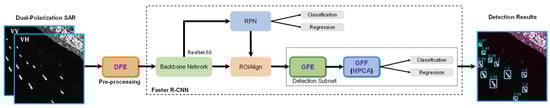 Firstly, GWFEF-Net preprocesses the input dual-polarization SAR images by the proposed DFE to enrich the dual-polarization features. The details will be introduced in Section 2.1. Then, GWFEF-Net uses a backbone network to extract ship features from dual-polarization SAR images. Without losing generality, we use the mainstream ResNet50 [26] as our backbone network. Then, an RPN is used for the extraction of regions of interest (i.e., regions containing ships). Afterward, a RoIAlign [27] layer is used to map the generated proposed regions by the RPN to the feature maps of the backbone network for subsequent classification and regression in the detection subnetwork. Finally, feature maps generated by the RoIAlign are input into a detection subnetwork for the final prediction, and the final ship detection results are obtained.