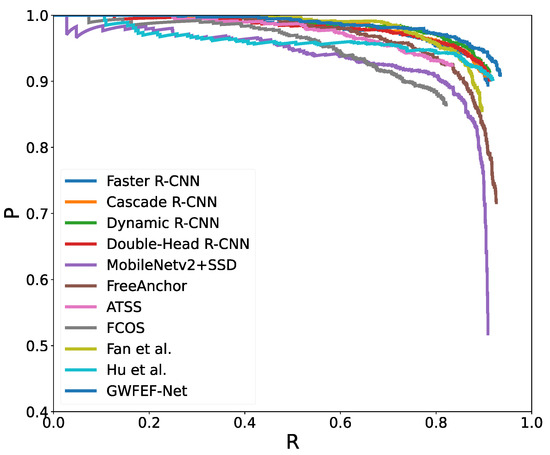 - The detection accuracy presents a gradual upward trend by gradually adding each contribution on the baseline Faster R-CNN. Apparently, GWFEF-Net offers a huge AP improvement (i.e., from initial 90.18% to final 94.18%), up to a 4% increment. Moreover, GWFEF-Net offers a perceptible F1 improvement (i.e., from initial 90.25% to final 93.64%), up to a ~3.4% increment. Other accuracy indexes have also been improved more or less, which fully proves the excellent detection performance of the proposed GWFEF-Net.
