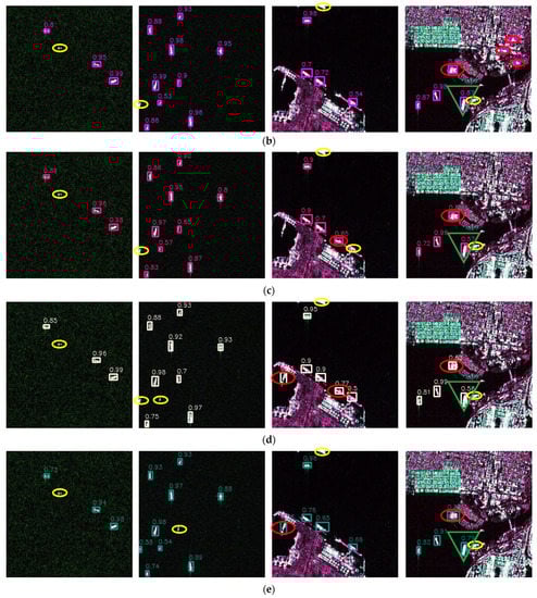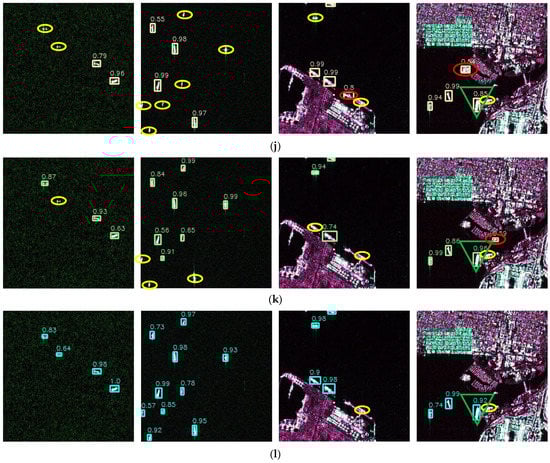 Table 3 shows the performance comparisons of GWFEF-Net with the other ten competitive models. In Table 3, this paper mainly chooses the Faster R-CNN [23], Cascade R-CNN [51], Dynamic R-CNN [52], Double-Head R-CNN [53], MobileNetv2+SSD [54,55], FreeAnchor [56], ATSS [57], FCOS [58], Fan et al. [21] and Hu et al. [22] for comparison. They all load the pre-training model on the backbone network and are trained on the DSSDD, and their implementation details are consistent with the original paper. It is worth noting that we select the mainstream one-stage detectors (i.e., MobileNetv2+SSD, FreeAnchor, ATSS and FCOS), the mainstream two-stage detectors (i.e., Faster R-CNN, Cascade R-CNN, Dynamic R-CNN and Double-Head R-CNN) in the CV field and typical polarimetric SAR ship detectors (i.e., Fan et al. [21] and Hu et al. [22]) for comparison.