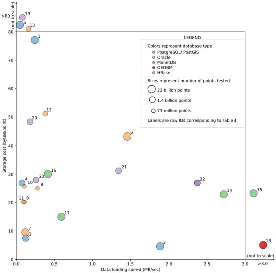 In that work by van Oosterom et al. [], the authors primarily investigate scalability with respect to different volumes of data loads. Their analysis includes a comparison of block model, point cloud data organization (where groups of points are stored together as a block) within Oracle and PostgreSQL and a flat table model point cloud organization (where each point is stored in a table row) within Oracle, PostgreSQL, and MonetDB. The authors also explain the use of the PC_PATCH ([]) data type and SDO_PC and SDO_PC and SDO_PC_BLK ([]) data types in PostgreSQL and Oracle databases for point data organization.