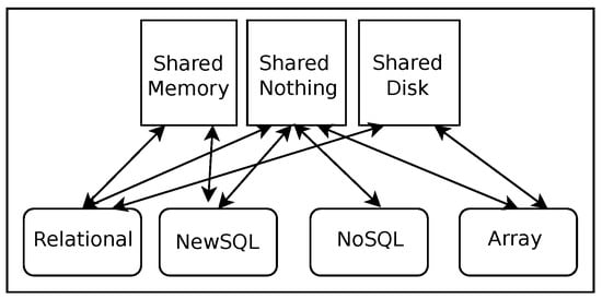 Currently, there is a myriad of databases from which data-intensive systems benefit. They serve a multitude of purposes and, thus, have different data models and are deployed in various parallel architectures. Data models are formats to receive and organize input data. Common ones include relational models, relational-columnar models, NoSQL models (i.e., key-value model, wide-column model, graph model), array models, and hybrid (multi-model and NewSQL) models. Databases that adhere to relational models can be deployed under all three data-intensive system architectures. NoSQL model databases and hybrid model databases are mainly deployed in shared-nothing architecture environments [,]. While array databases can also be deployed in shared-memory architectures, in practice array databases are predominantly used in shared-disk or shared-nothing architectures [].
