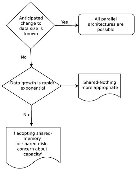 Notably, Ozsu et al. [], observed that given the same level of parallelism, shared-memory architecture-based systems typically yielded the best performance, while shared-nothing architecture-based systems yielded the least performance. In all three considered architectures adding more nodes/cores or more powerful nodes/cores typically results in higher levels of parallelism in the system. As a result, more processors (and CPUs), memory, and disk units are available for data management tasks. Hence, the performance, particularly the data loading and querying, typically improve. Although the addition of nodes/cores generally results in improved performance, in PCDM literature, this can be seen only in shared-nothing architecture-oriented PCDM work. More specifically, the current shared-memory and shared-disk architecture-oriented PCDM systems do not demonstrate the performance improvements that PCDM systems can yield when more core/processor-memory nodes are added to an existing PCDM system [,,,,,,,]. A potential reason could be the infeasibility of adding more cores/processor-memory nodes to existing systems once the systems are configured.