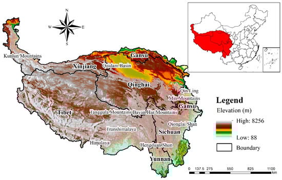 The QTP (73°29′E–105°37′E, 24°40′N–40°39′N), covering 3 million km2, is the largest geographical unit in China and also the geographical unit with the highest elevation on earth (Figure 1) [,]. The QTP acts as an important reservoir for water, regulating climate change and water resources in east Asia and even for the entire world []. The southern and eastern marginal mountainous rivers are densely packed, with larger outflows to the Indian Ocean system of the Brahmaputra and Nu Rivers and upper outflows to the Pacific Ocean system of the Yangtze, Yellow, and Lancang Rivers [,]. The distribution of rain and heat is extremely uneven, with the southeast region experiencing average temperatures of 20 °C and the northwest experiencing average temperatures as low as 6 °C. The annual precipitation in the south is 1000–4000 mm, but it is only 20–100 mm in the west []. Because of its high average altitude, low average temperature, and complex topography, the QTP has a unique alpine ecosystem and is easily affected by ecological and environmental issues due to global warming and human activities []. To maintain regional ecological security, a series of measures have been adopted, including setting an ecological redline, strengthening the environmental protection system, repairing damaged ecology, and boosting government oversight [,].