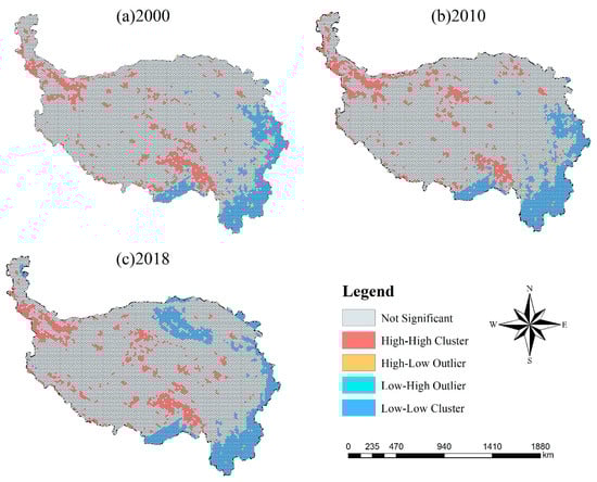 LISA (local indicator of spatial association) aggregation of the remote sensing ecological vulnerability index on the Qinghai-Tibet Plateau in 2000 (a), 2010 (b), and 2018 (c).
