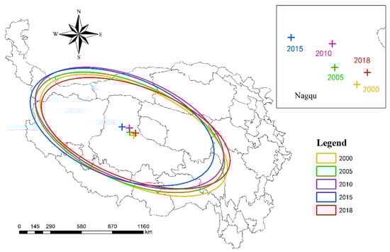 The standard deviation ellipse and its gravity center of the spatially distributed remote sensing ecological vulnerability index on the Qinghai-Tibet Plateau from 2000 to 2018.