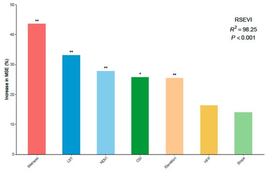 The importance scores of the driving factors affecting the remote sensing ecological vulnerability index (RSEVI) on the Qinghai-Tibet Plateau. Significance levels are as follows: * p < 0.05, ** p < 0.01. MSE, mean squared error.