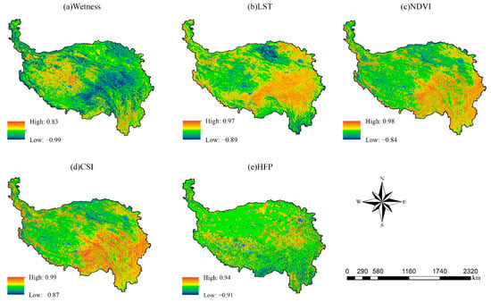 The SCC, which can more visually show the spatial distribution of the driving factors, was used to spatialize the driving factors. Our results indicated that wetness and LST were the two most important driving factors, and their correlation with the RSEVI was almost complementary. In regions with adequate precipitation, temperature was the main driving factor, while in regions with suitable temperature, precipitation was the main driving factor. Both the NDVI and the CSI showed positive correlations and strong effects on the RSEVI in the southeastern area of the QTP, including the potential vulnerability and slight vulnerability areas located in Yunnan Province, Sichuan Province, and southern Tibet, as well as the extreme vulnerability areas located in the Transhimalaya. The HFP showed a negative correlation in the southeast, which was the most densely populated and economically developed area. These regions had low ecological vulnerability due to abundant precipitation, suitable temperature, low elevation, and sufficient water resources, which resulted in diverse landscape patterns and a high vegetation cover, despite the disturbance of the natural environment from human activities [].
